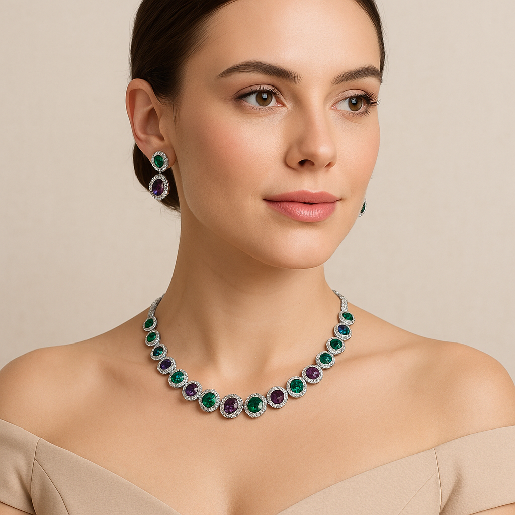 Graceful Silver-Toned CZ Diamond Necklace & Earrings Set with Teardrop Pendant
