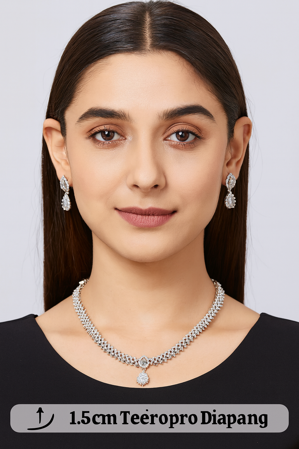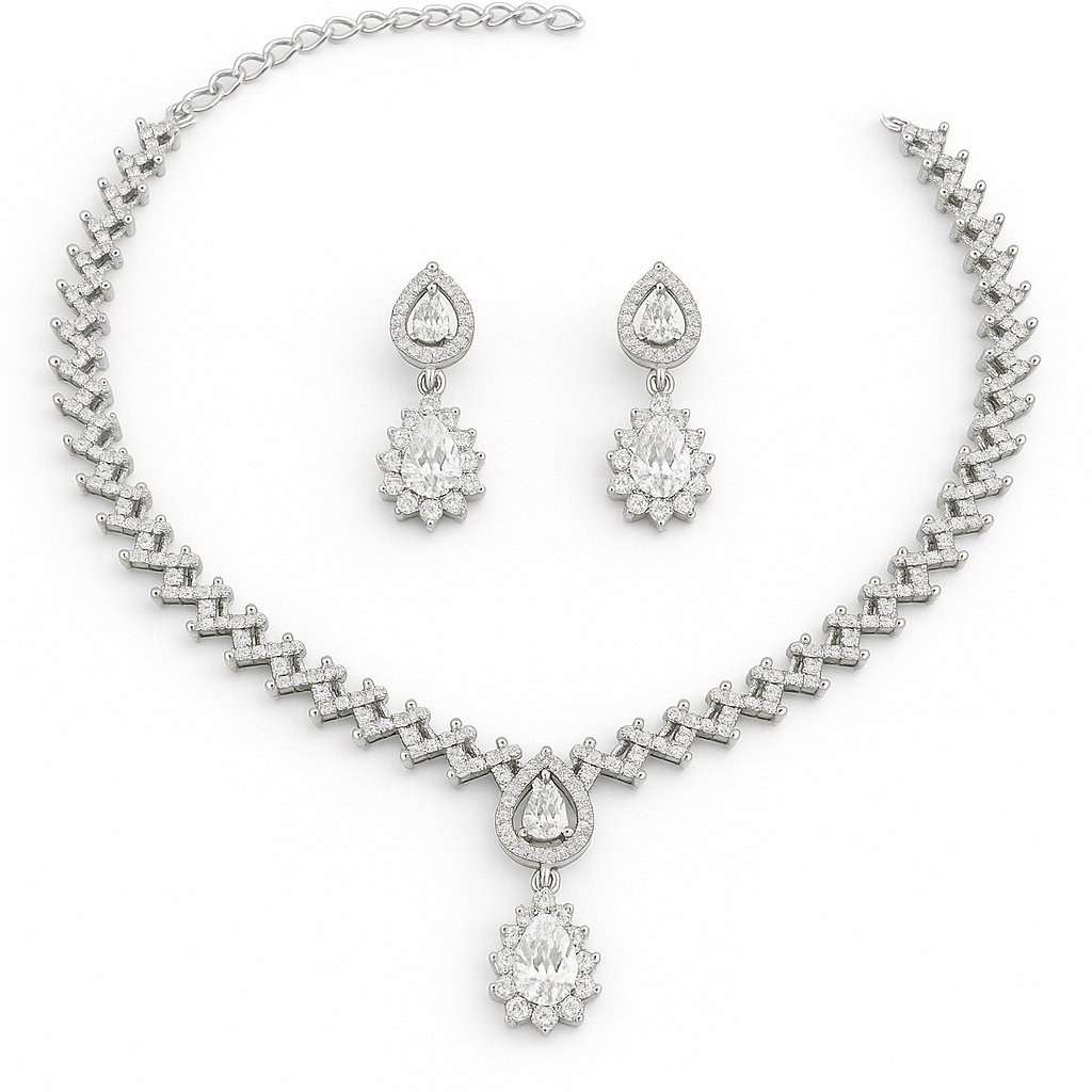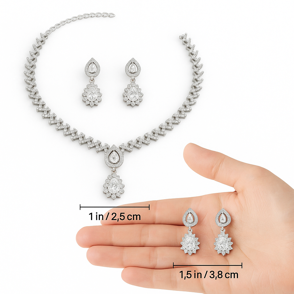 Classic Rhodium-Plated Diamond Look Necklace & Earrings Set with Solitaire Drop Pendant