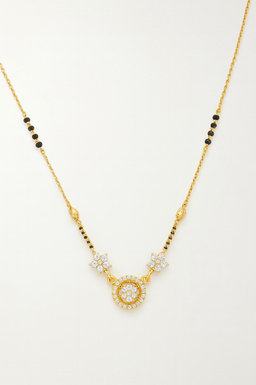 Celebrate tradition with a touch of modern sparkle in this beautifully crafted gold-plated mangalsutra. Featuring a delicate chain adorned with classic black beads, the centerpiece is designed with two floral motifs flanking a radiant circular pendant encrusted with dazzling white CZ stones.