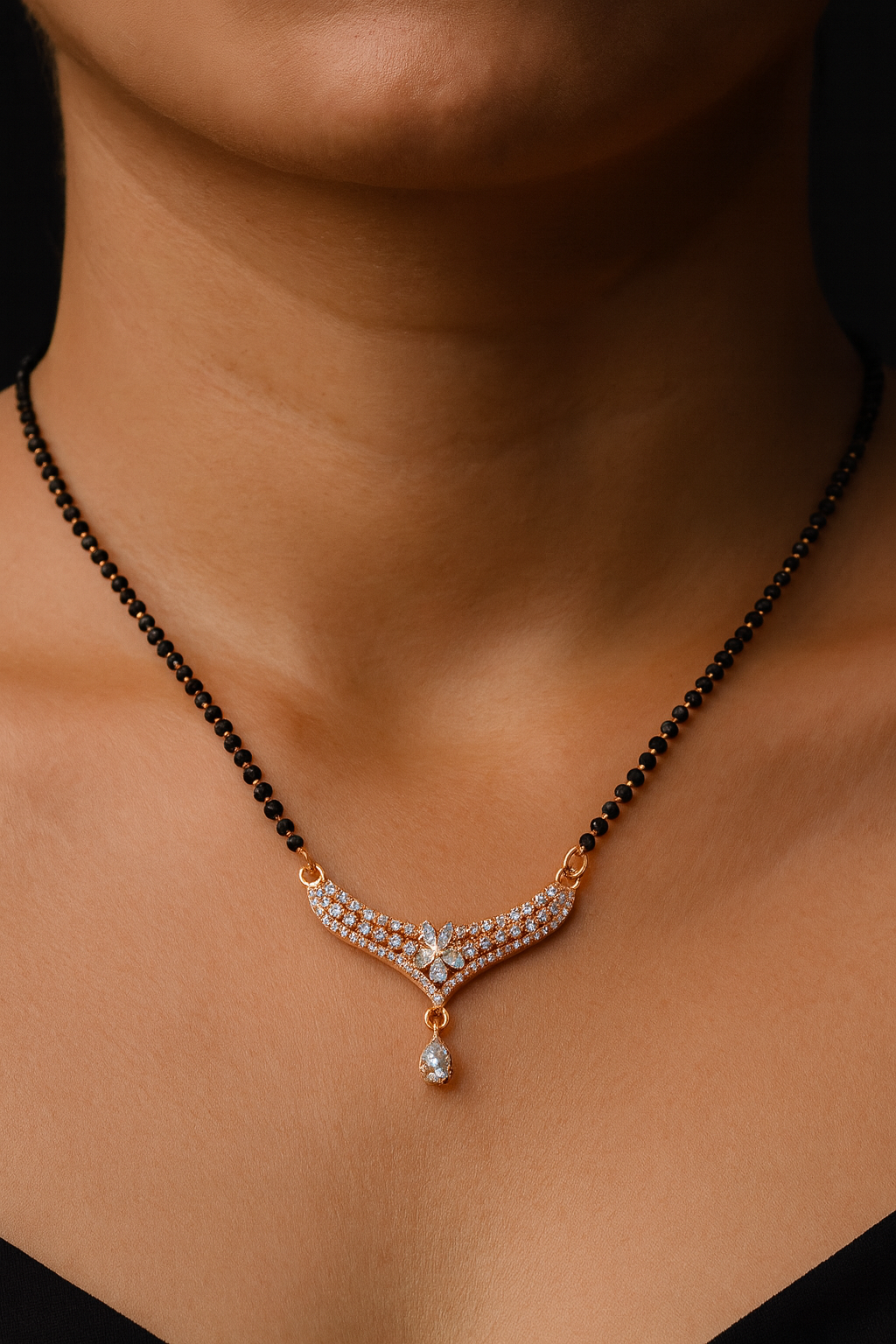 Add timeless beauty to your collection with this gold-plated mangalsutra, featuring a graceful floral-inspired pendant adorned with sparkling CZ stones. The elegant teardrop dangler enhances its charm, making it perfect for both everyday wear and special occasions.