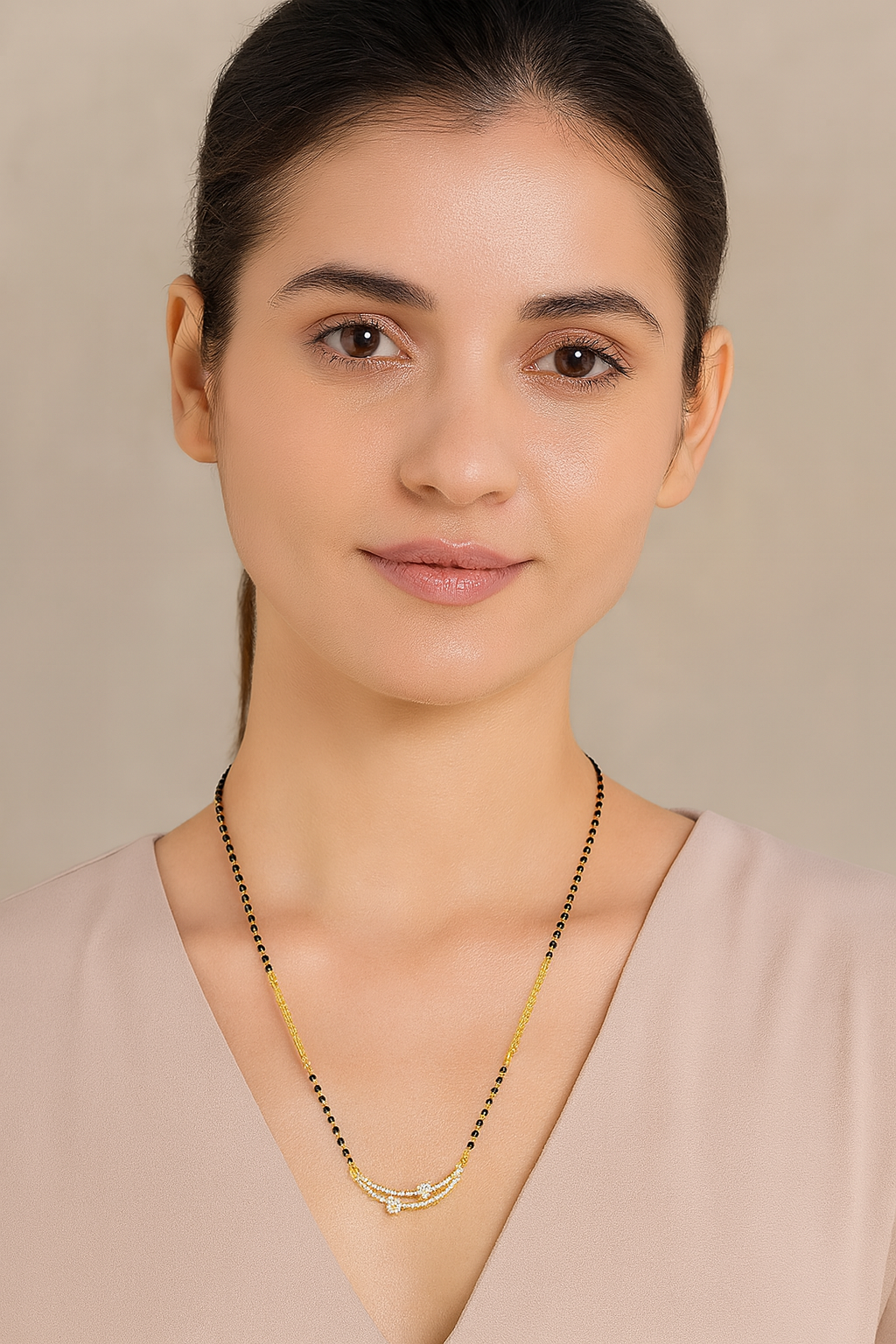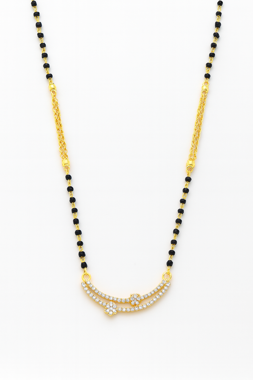 Add a touch of timeless elegance to your look with this beautifully crafted gold-plated mangalsutra. Featuring a curved pendant adorned with sparkling white CZ stones and delicate floral detailing, this piece blends modern sophistication with traditional charm. The double-strand chain with alternating black beads and gold links adds depth and grace, making it perfect for daily wear as well as special occasions.