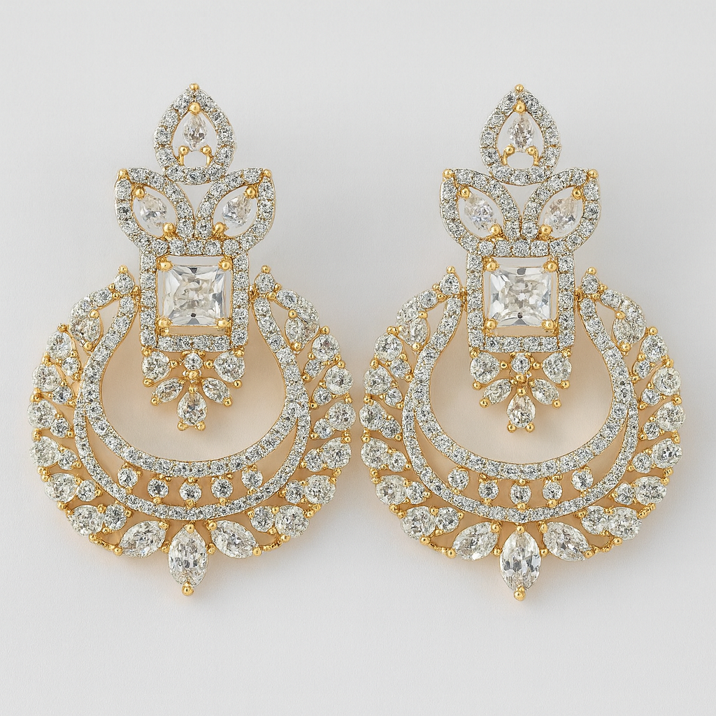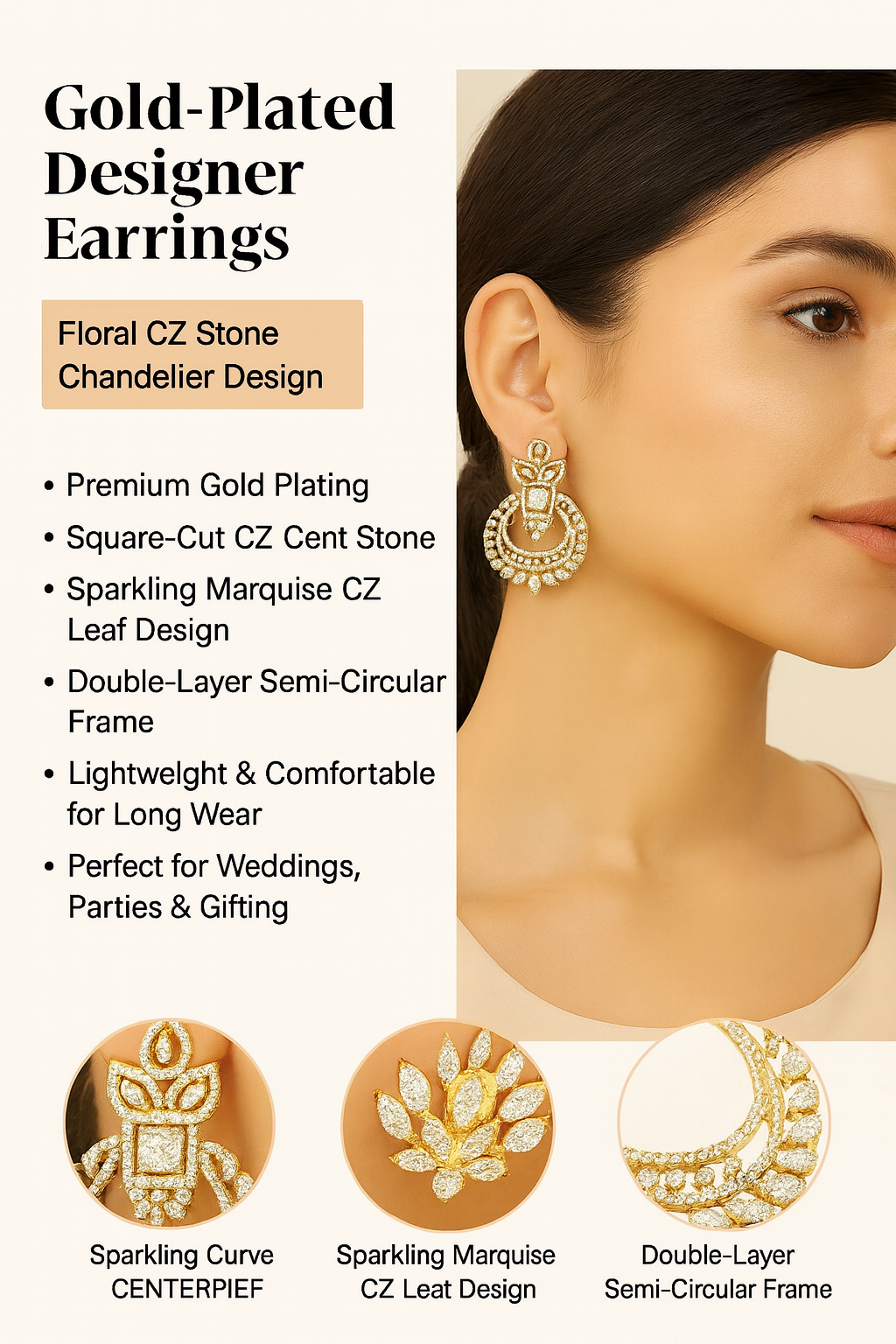 Turn heads with these gorgeous gold-plated chandelier earrings featuring a brilliant combination of sparkle, symmetry, and tradition. Designed to make a bold statement, the earrings boast a striking square-cut CZ stone at the center, surrounded by floral-inspired motifs and arching curves embellished with dazzling round and marquise CZ stones.