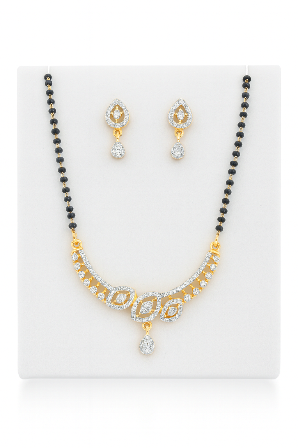 Celebrate your bond with this elegant gold-plated mangalsutra set, complete with matching earrings. The necklace features a double-strand black-bead chain attached to a beautifully curved pendant encrusted with sparkling white cubic zirconia stones. Three open marquise motifs form the centerpiece, with a teardrop CZ dangler adding a graceful finish. The matching earrings mirror the design with a teardrop stud and delicate drop. Perfect for daily wear, festive occasions, or as a wedding gift.