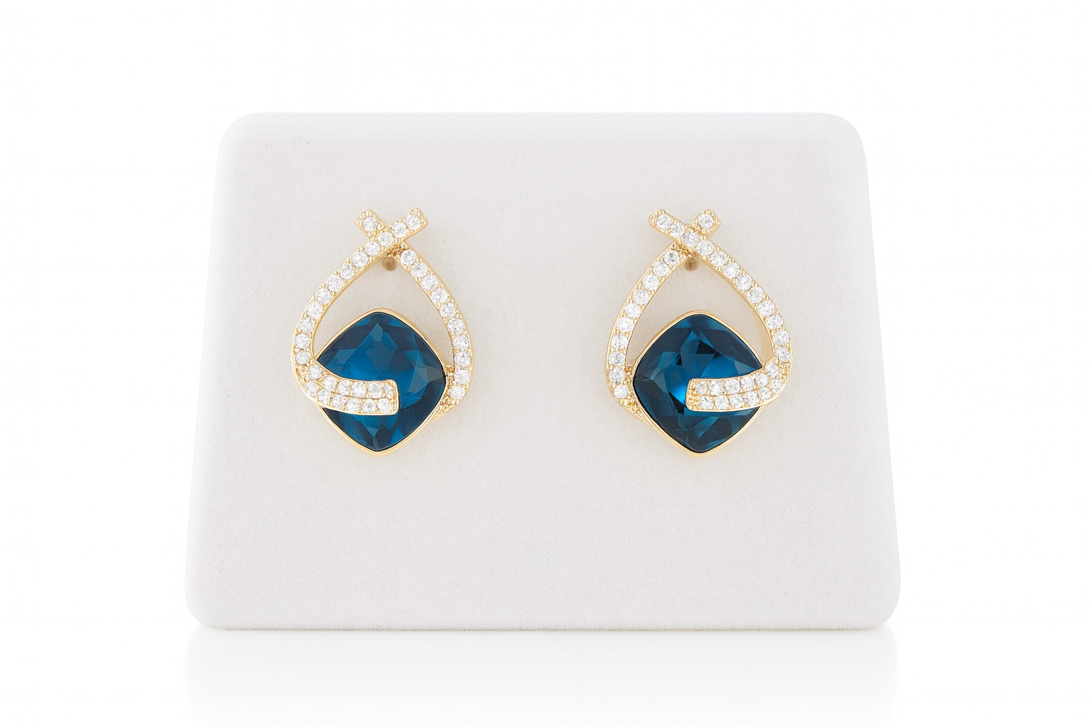 Add a pop of color and elegance to your collection with these gold-plated drop-frame earrings. The design features a striking cushion-cut deep blue gemstone at the center, set within a teardrop-shaped gold frame adorned with sparkling cubic zirconia. A graceful curved CZ-studded band sweeps across the stone, adding a touch of luxury and modern charm. Perfect for evening wear, weddings, and special occasions.