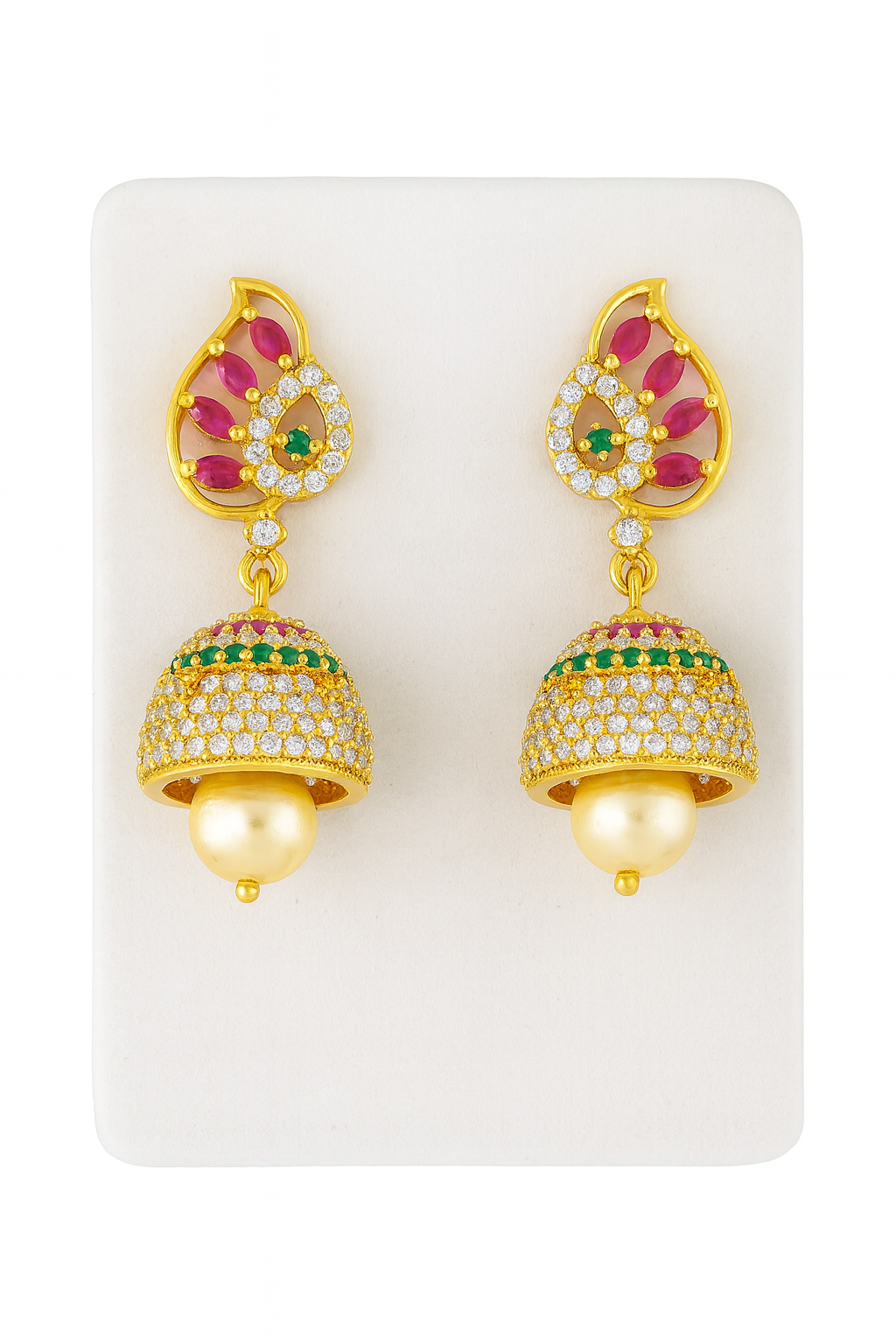 Gold-Plated Jhumka Earrings with Ruby, Emerald, and Pearl Detailing