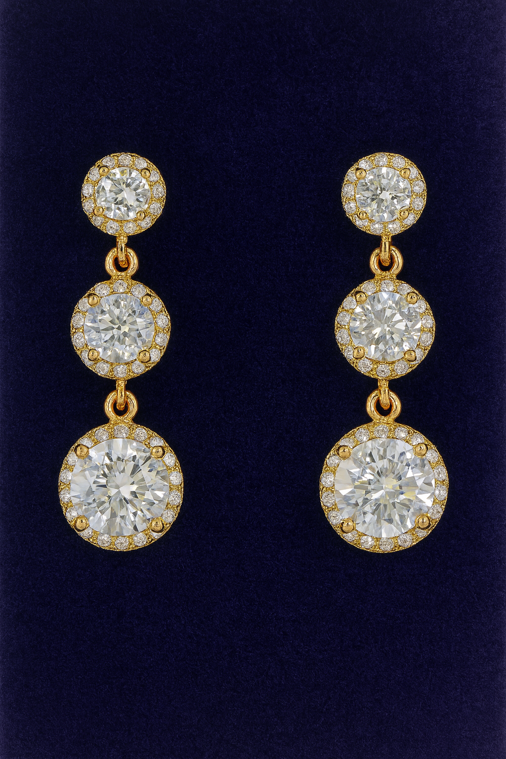 Add a refined sparkle to your look with these triple-drop CZ earrings by DC Jewelry. Each earring features three brilliant round-cut cubic zirconia stones graduating in size and framed by shimmering micro CZ halos — the perfect blend of glamour and grace.
