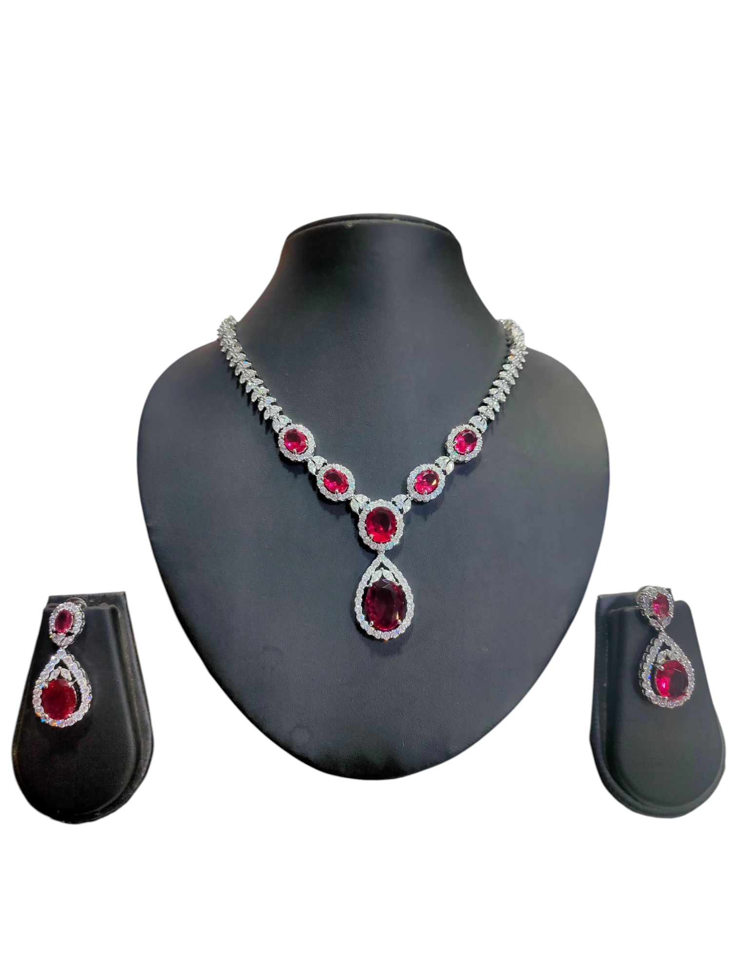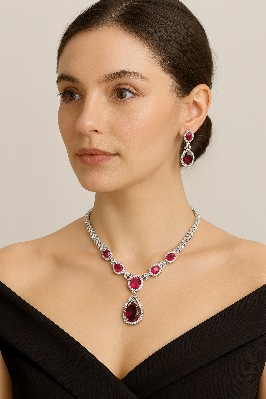 Radiant Ruby Red Stone Necklace & Earrings Set with Diamond Accents