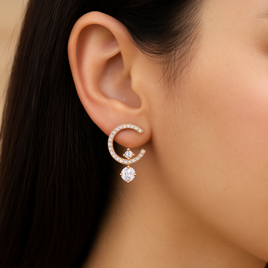 Showcase contemporary elegance with these stunning rose gold-plated crescent earrings, adorned with high-shine cubic zirconia stones. The open crescent shape is studded with brilliant white CZ stones, giving a sophisticated sparkle from every angle. A geometric princess-cut stone sits at the base, leading to a round-cut CZ drop that adds subtle movement and charm.
