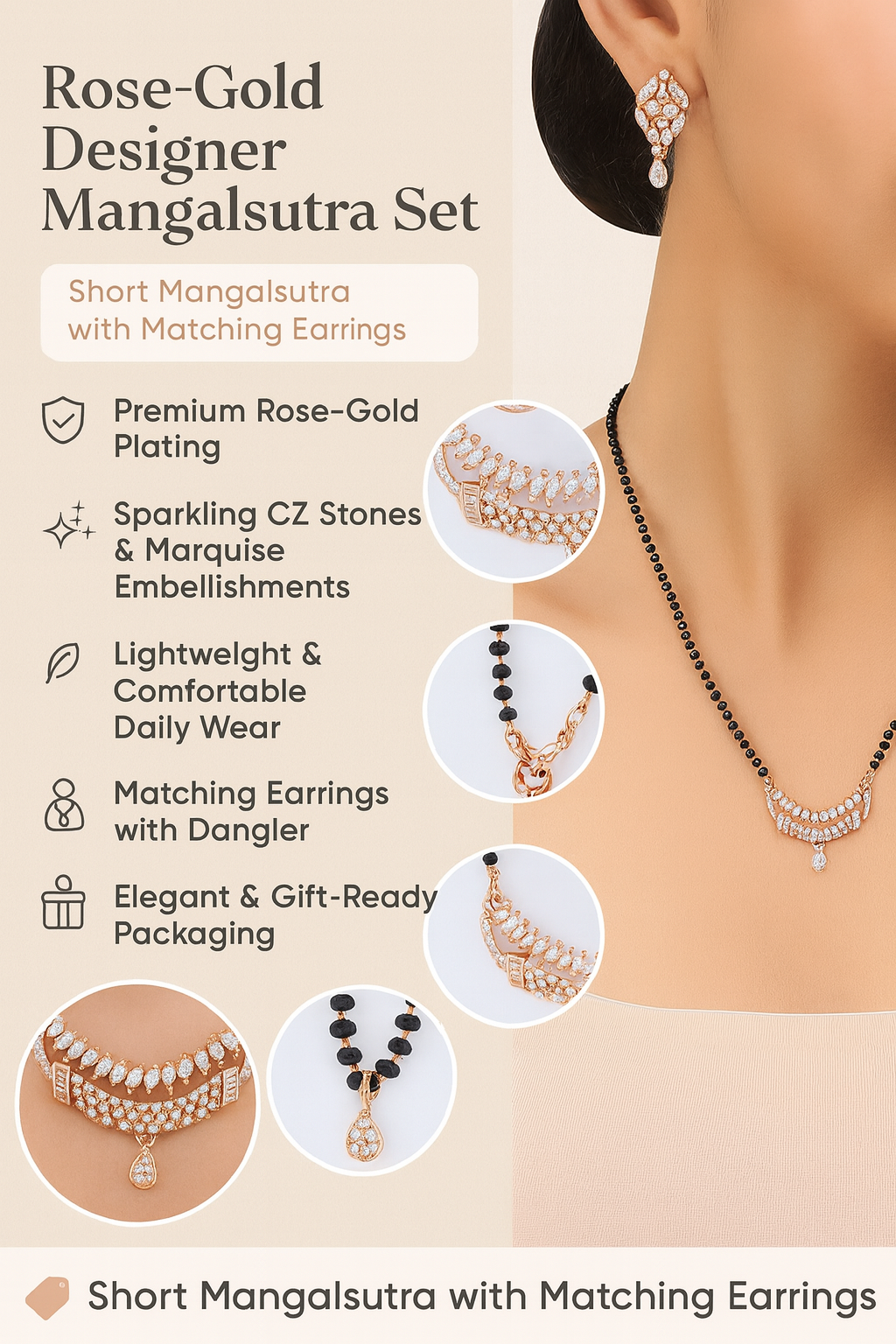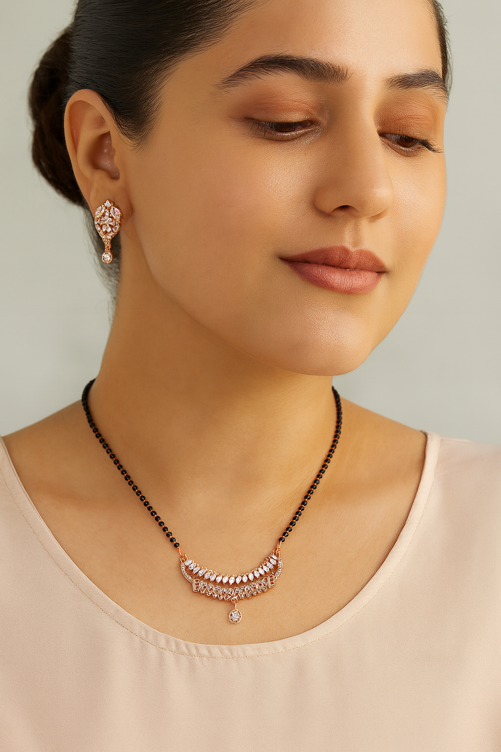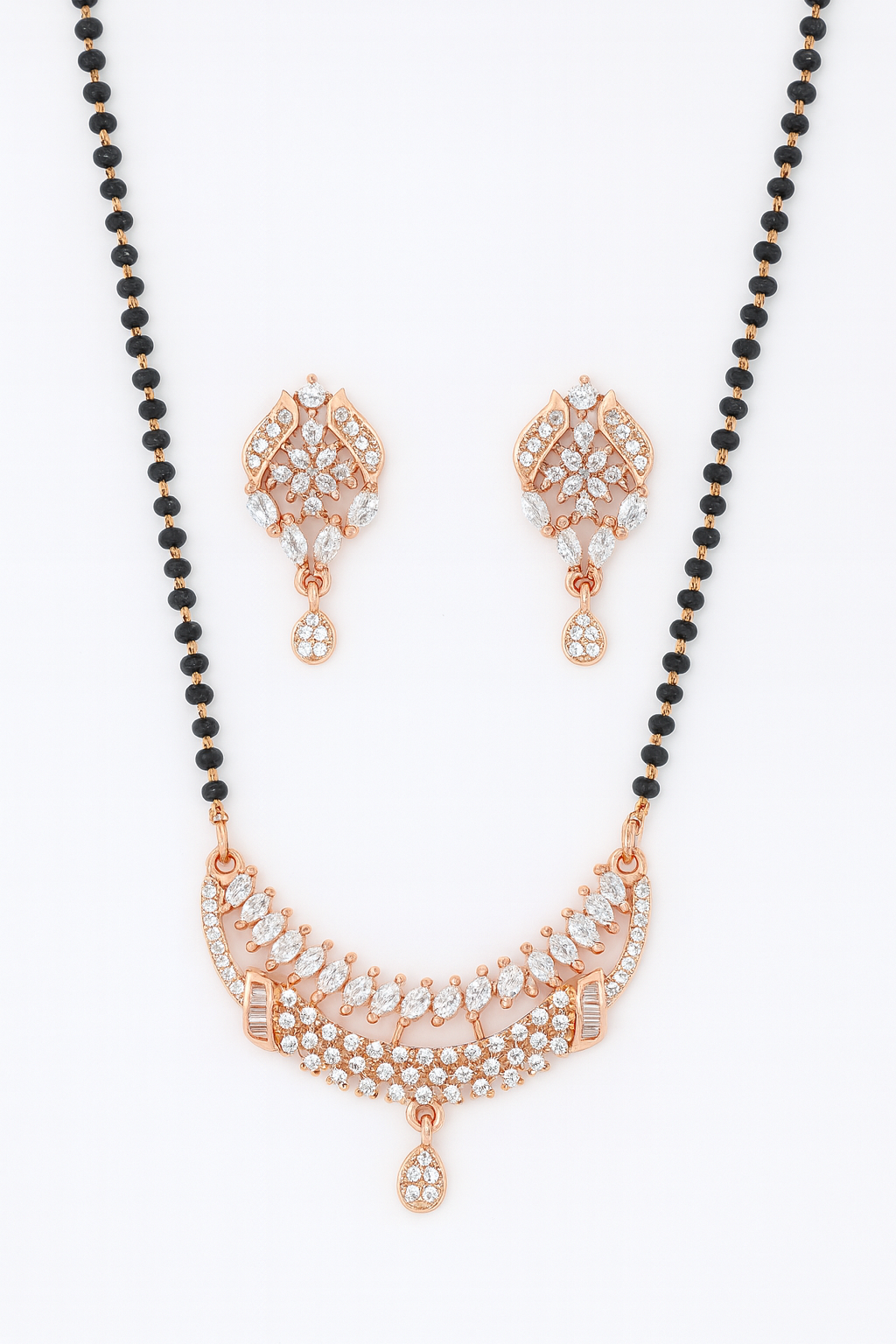 Rose Gold-Plated Designer Mangalsutra with Matching Earrings | CZ Stone Bridal Set