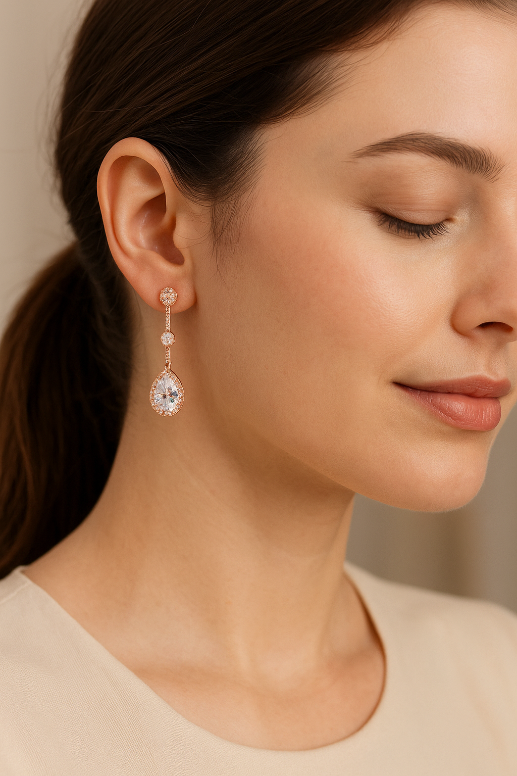 The delicate beaded detailing along the drop enhances the design’s sophistication, making them perfect for weddings, cocktail evenings, or special celebrations.