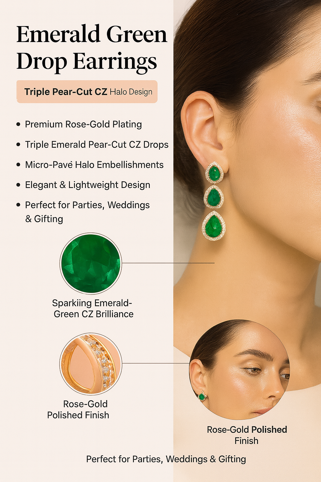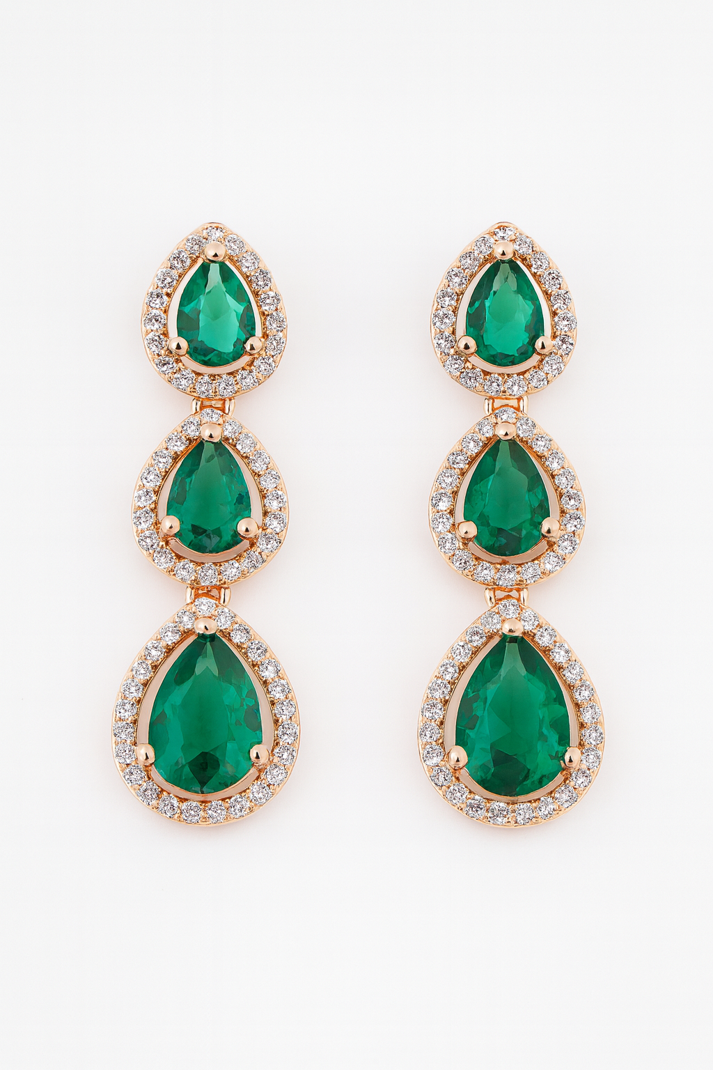 Rose-Gold Triple Emerald Drop Earrings – CZ Halo Statement Design