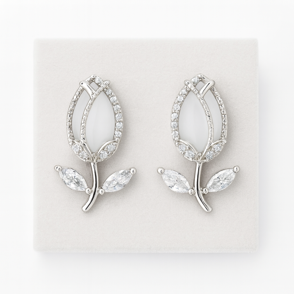 Bring a touch of floral elegance to your style with these silver-plated tulip stud earrings. Featuring a graceful tulip-shaped outline adorned with sparkling cubic zirconia stones, each earring is completed with delicate marquise-cut CZ leaves for a refined finish. Perfect for adding a feminine charm to both casual and formal outfits.