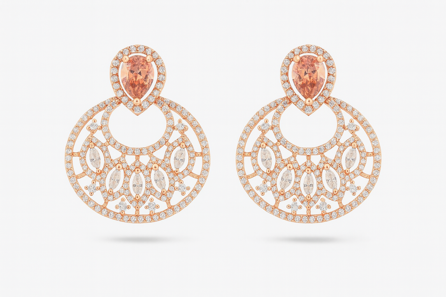 Rose-Gold Chandelier Earrings with Marquise CZ & Peach Teardrop Stud – Party & Bridal Wear