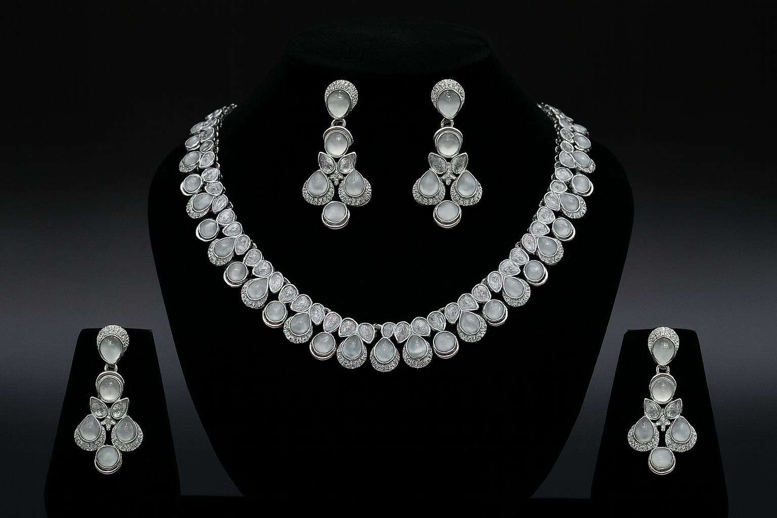 A luxurious necklace and earrings set featuring milky-white moonstone teardrops, perfectly set in a silver-tone frame. Each element is outlined with clear, sparkling CZ stones to add brilliance and depth. Ideal for weddings, festive occasions, or sophisticated evening wear.